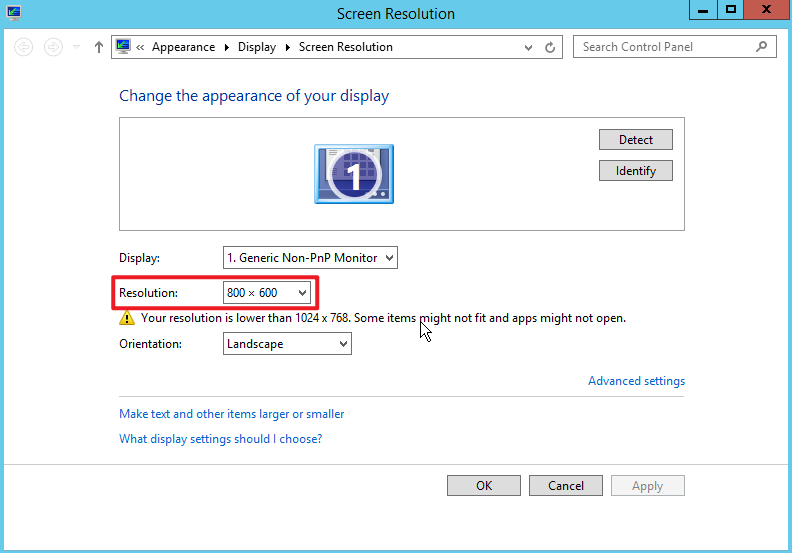 3. Di jendela “Screen Resolution” (Resolusi Layar), atur Resolution (Resolusi) ke nilai yang Anda inginkan dan klik Apply (Terapkan), seperti yang ditunjukkan di bawah ini: