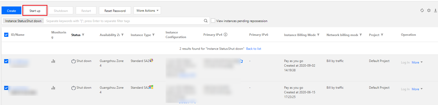 Starting up the instances (Memulai instans): pilih instans yang ingin Anda mulai, dan klik Start up (Mulai) di bagian atas daftar untuk memulai instans yang dipilih, seperti yang ditunjukkan di bawah ini: