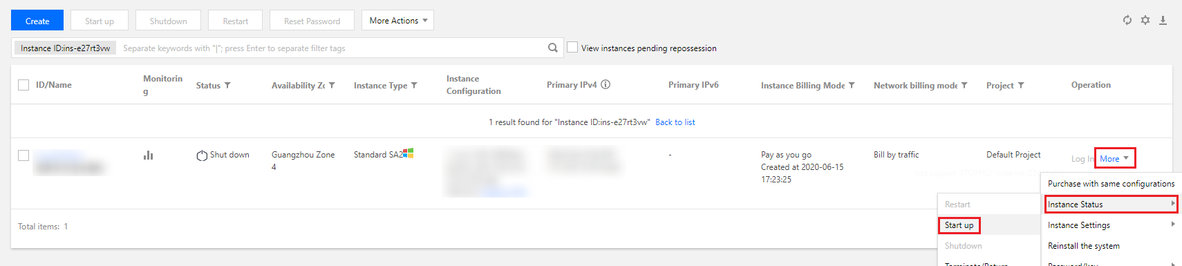Starting up one instance (Memulai satu instans): pilih instans yang ingin Anda mulai, lalu klik More (Lainnya) -> Instance Status (Status Instans) -> Start up (Mulai) di kolom Operation (Operasi) di sebelah kanan, seperti yang ditunjukkan di bawah ini:
