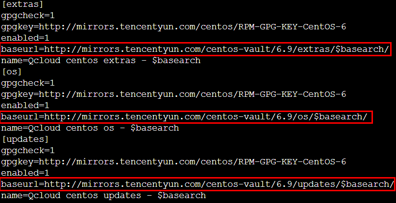 baseurl sesuai dengan versi CentOS dan lingkungan jaringan.http://mirrors.tencentyun.com/centos-vault/6.x/https://mirrors.cloud.tencent.com/centos-vault/6.x/CentOS-Base.repo yang dimodifikasi adalah sebagai berikut: