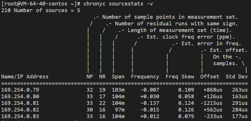 chronyc sourcestats -v | Periksa status sumber jam. |
