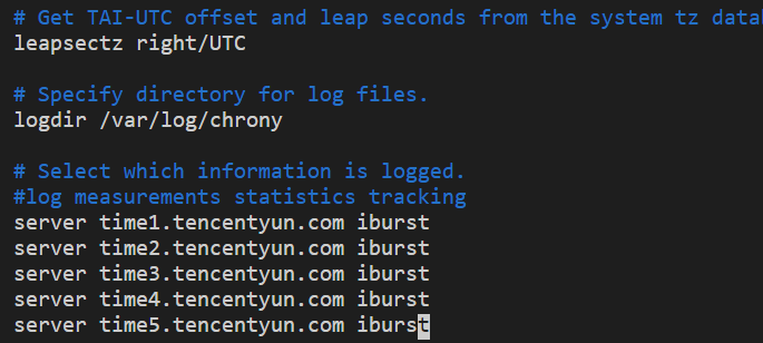 #log measurements statistics tracking.server time1.tencentyun.com iburstserver time2.tencentyun.com iburstserver time3.tencentyun.com iburstserver time4.tencentyun.com iburstserver time5.tencentyun.com iburst