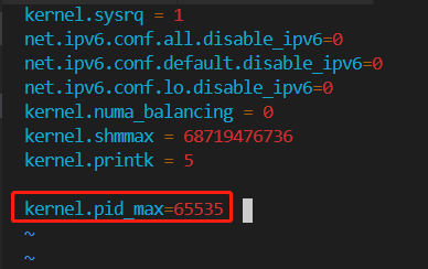 pid_max, utas baru akan menyebabkan kesalahan “fork: Cannot allocate memory” (fork: Tidak dapat mengalokasikan memori).ps -efL untuk menemukan program yang menjalankan banyak utas.kernel.pid_max dalam file konfigurasi /etc/sysctl.conf menjadi 65535 untuk menambah jumlah utas. Hasilnya harus sebagai berikut: