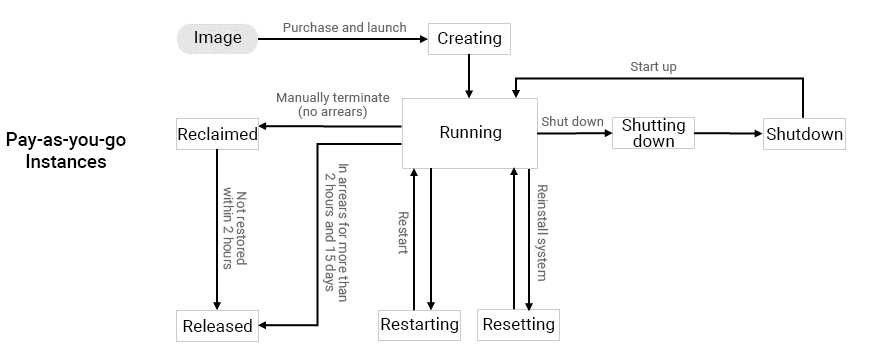 Setelah instans diluncurkan, instans tersebut akan memasuki status pembuatan. Misalnya dalam status ini, spesifikasi perangkat kerasnya akan dikonfigurasi sesuai dengan jenis instans yang ditentukan, dan sistem akan meluncurkan instans menggunakan citra yang ditentukan saat peluncuran. Instans akan memasuki status berjalan setelah dibuat. Instans dalam status berjalan dapat dihubungkan dan diakses secara normal.