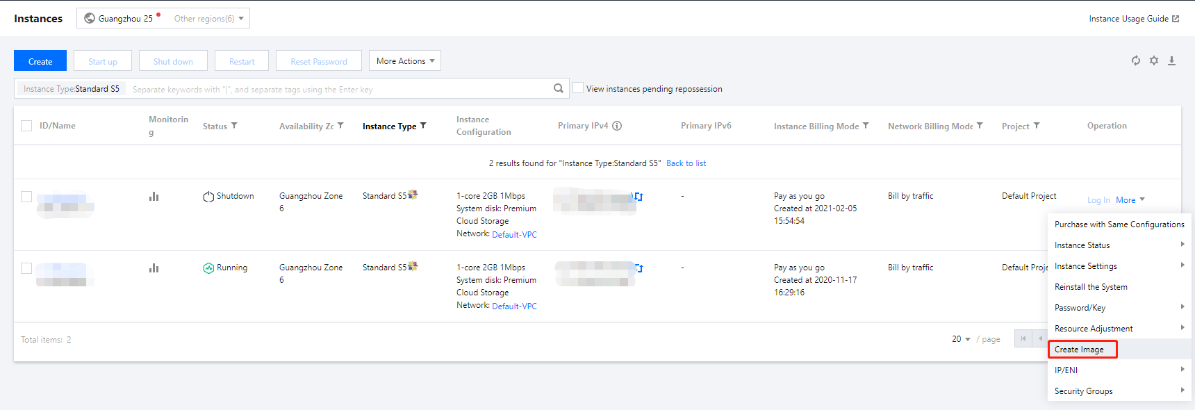 Citra menggunakan layanan snapshot CBS untuk penyimpanan data. Saat Anda membuat citra kustom, snapshot akan dibuat secara otomatis dan dikaitkan dengan citra tersebut. Anda akan dikenakan biaya untuk snapshot ini. Untuk informasi selengkapnya, lihat Ikhtisar Penagihan. Untuk CVM yang dibuat berdasarkan citra publik setelah Juli 2018 dan menggunakan disk cloud sebagai disk sistem, Anda dapat membuat citra tanpa menonaktifkan instans. Untuk CVM lain, Anda harus mematikan instans sebelum membuat citra kustom untuk memastikan bahwa citra memiliki lingkungan deployment yang sama dengan instans saat ini.