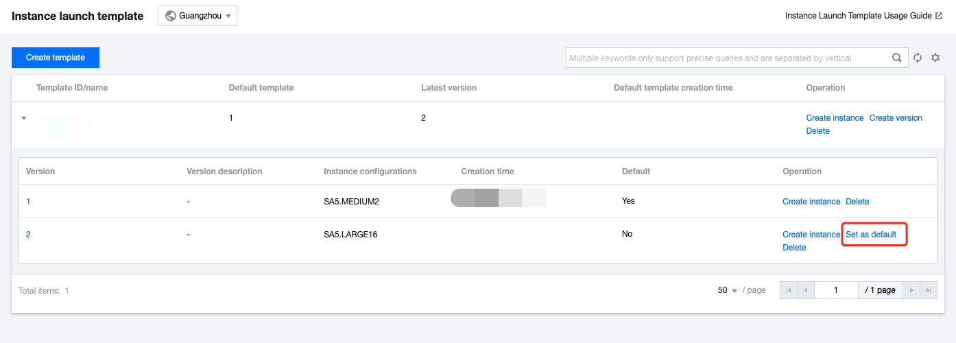 Setelah berhasil dibuat, Anda dapat mengklik di depan baris template pada halaman Template Startup Instans, dan lihat versinya dalam daftar yang diperluas. Tentukan versi default dari template instans
