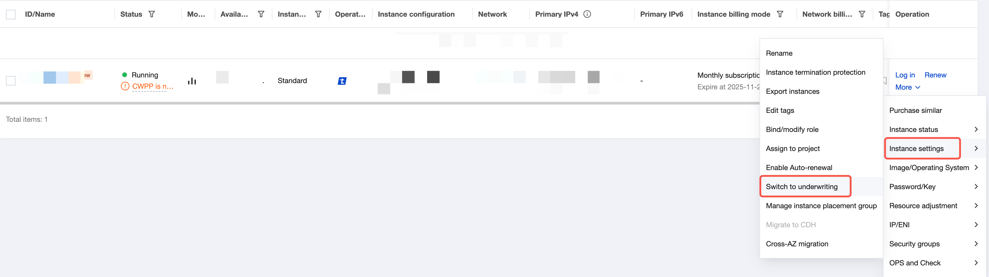 Tampilan daftar: Di bilah operasi sebelah kanan, pilih Lainnya > Pengaturan Instance > Konversi Berlangganan Tahunan/Bulanan ke Komitmen Konsumsi. Seperti yang ditunjukkan di bawah ini: