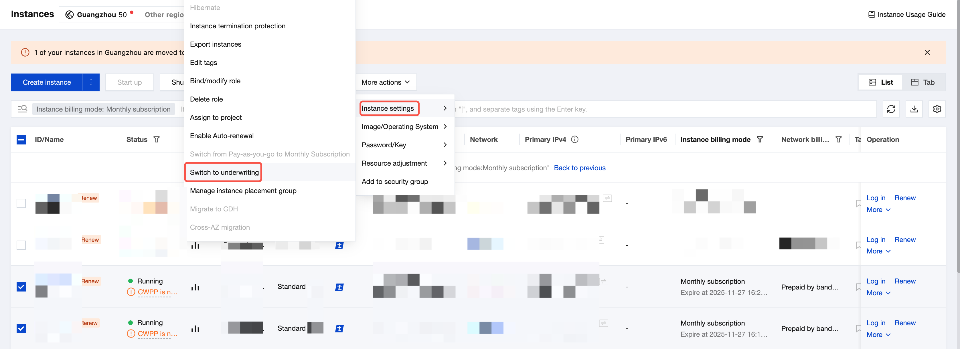 Anda juga dapat mencentang instance yang perlu dikonversi, lalu klik Operasi Lainnya > Pengaturan Instance > Konversi Berlangganan Tahunan/Bulanan ke Komitmen Konsumsi di bagian atas.