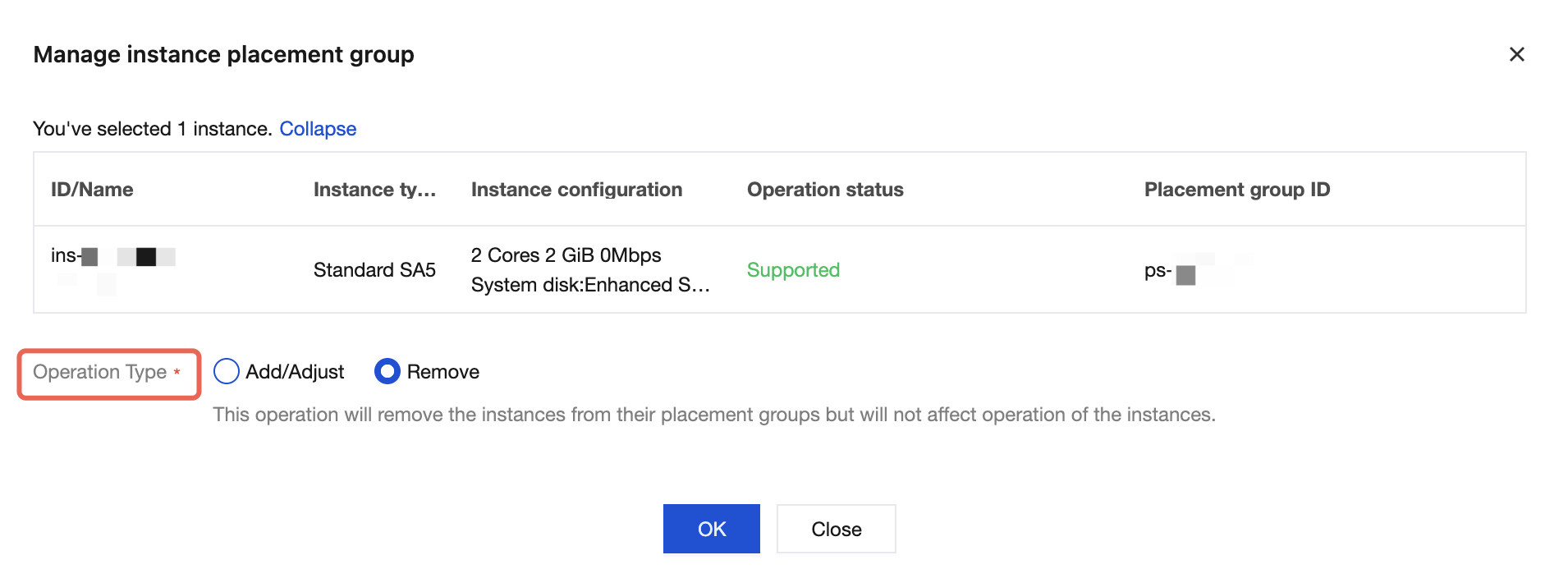 Jika instance yang dipilih tidak termasuk dalam grup penempatan mana pun, maka hanya operasi "Tambahkan/Sesuaikan" yang dapat dilakukan, sedangkan operasi "Hapus" tidak tersedia.