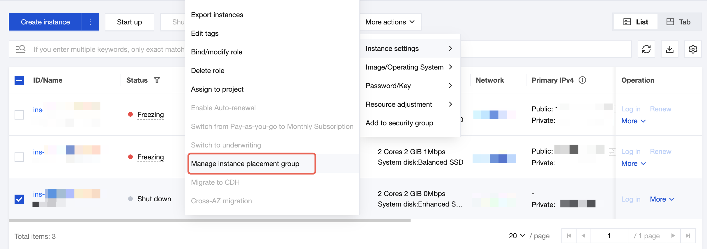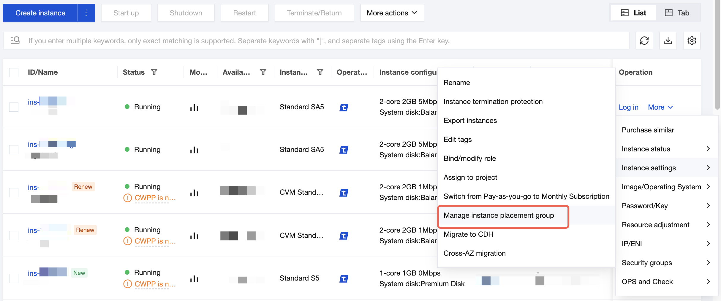 Operasi Batch: Centang satu atau lebih instance target, lalu klik Operasi Lainnya > Pengaturan Instance > Manajemen Grup Penempatan Instance di bagian atas daftar instance.