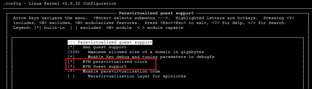 Jika tidak dipilih, tekan bilah spasi untuk memilih opsi "KVM paravirtualized clock" (Jam paravirtualisasi KVM) dan "KVM Guest support" (Dukungan Tamu KVM). 9. Tekan "Esc" untuk kembali ke antarmuka utama "Linux Kernel vX.X.XX Configuration" (Konfigurasi vX.X.XX Kernel Linux).