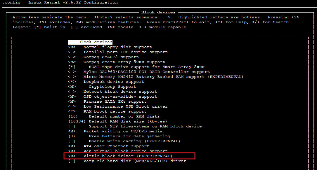 12. Di antarmuka detail Perangkat pemblokiran, periksa apakah "Virtio block driver (EXPERIMENTAL)" (Driver pemblokiran Virtio (EKSPERIMENTAL)) dipilih seperti yang ditunjukkan di bawah ini: