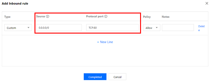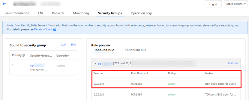 Jika Allow by Default (Izinkan secara Default) dinonaktifkan, Anda perlu mengizinkan IP klien di grup keamanan CVM.Lalu lintas bisnis hanya diizinkan mengakses CVM dari port 80 CLB dan menggunakan layanan yang disediakan melalui port 8080 CVM.