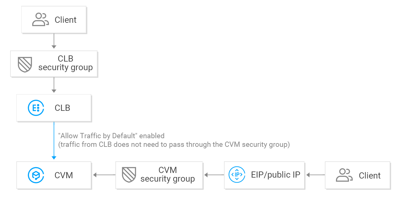 Jika Allow by Default (Izinkan secara Default) dinonaktifkan: Jika Anda hanya ingin mengizinkan akses dari IP klien tertentu, Anda harus mengizinkan IP klien dan port pendengaran di grup keamanan CLB dan juga mengizinkan IP klien dan port layanan di grup keamanan CVM; oleh karena itu, lalu lintas bisnis yang melewati CLB akan diperiksa dua kali oleh baik grup keamanan CLB dan grup keamanan CVM.