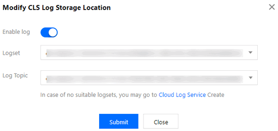 4. Di jendela pop-up Modify CLS Log Storage Location (Modifikasi Lokasi Penyimpanan Log CLS), aktifkan pencatatan dan pilih logset tujuan serta topik log untuk penyimpanan log akses, lalu klik Submit (Kirim).Jika Anda belum membuat logset atau topik log, silakan buat sumber daya yang relevan, lalu pilih sumber daya tersebut sebagai lokasi penyimpanan.