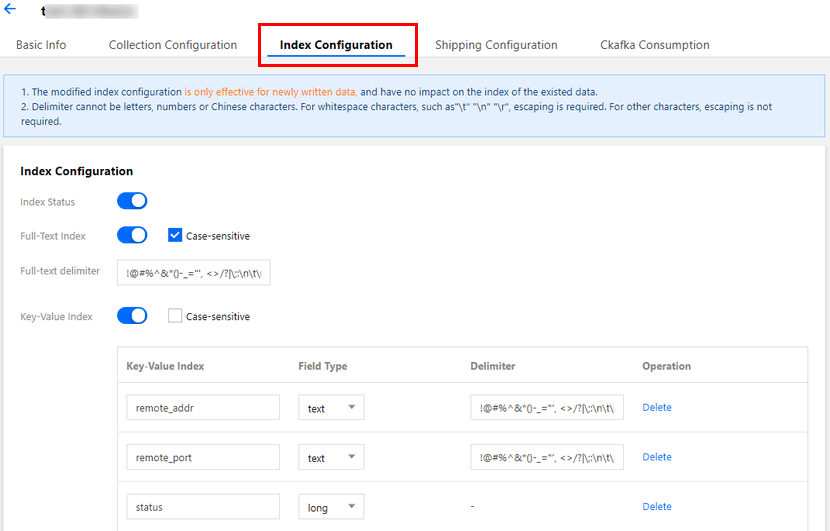 3. Di halaman detail topik log, pilih tab Index Configuration (Konfigurasi Indeks), lalu klik Edit (Edit) untuk menambahkan indeks.Lihat Mengonfigurasi Indeks untuk informasi selengkapnya tentang konfigurasi indeks. 4. Hasil konfigurasi indeks seperti yang ditunjukkan di bawah ini: