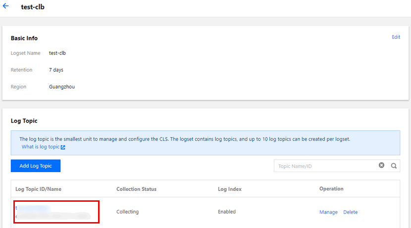 Ketika membuat topik log, Anda dapat menambahkan instance CLB sesuai kebutuhan.Untuk menambahkan instance, pilih topik log dalam daftar, lalu klik Manage (Kelola) di kolom operasi.Setiap instance CLB hanya dapat ditambahkan ke satu topik log.