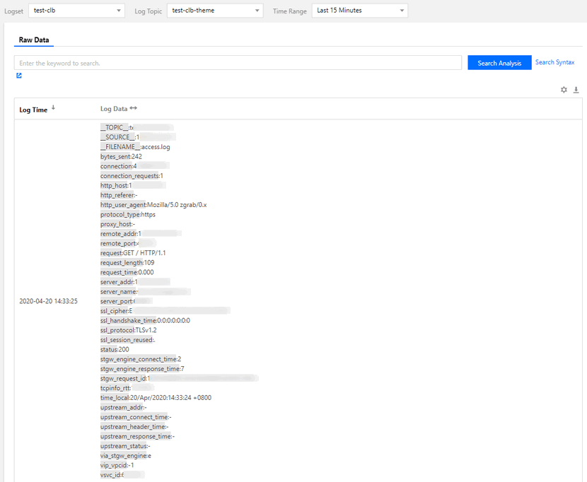 1. Masuk ke Konsol CLS, lalu klik Search and Analysis (Pencarian dan Analisis) di bilah sisi kiri. 2. Di halaman Search Analysis (Cari Analisis), pilih logset, topik log, dan rentang waktu, lalu klik Search Analysis (Cari Analisis) untuk mencari log akses yang dilaporkan oleh CLB ke CLS.Lihat Sintaks Pencarian CLS Lama untuk informasi selengkapnya tentang sintaks pencarian. Metode 2:Konfigurasi pencatatan akses secara batch