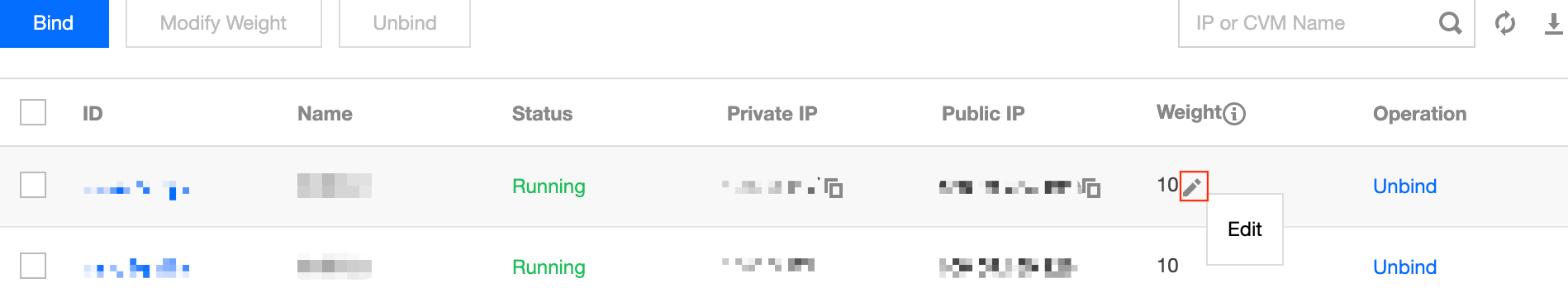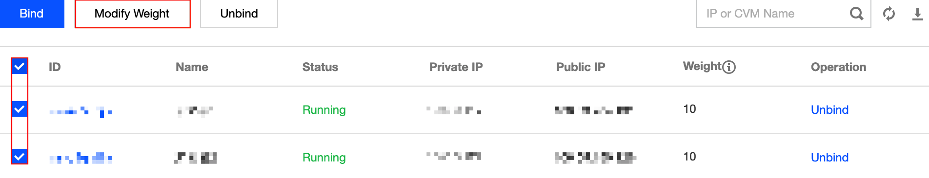 1.Klik kotak di depan server, pilih beberapa server, dan klik Modify Weight (Modifikasi Bobot) di bagian atas daftar.