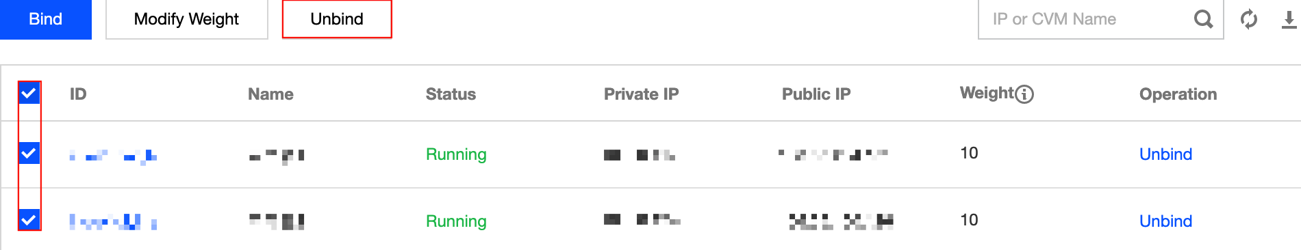 1.Klik kotak di depan server, pilih beberapa server, dan klik Unbind (Lepas Ikatan) di bagian atas daftar.