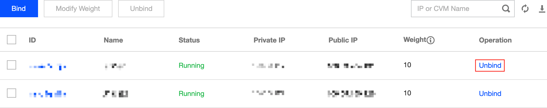 1.Temukan server yang perlu dilepas ikatannya dan klik Unbind (Lepas Ikatan) di kolom Operation (Operasi) di sebelah kanan.
