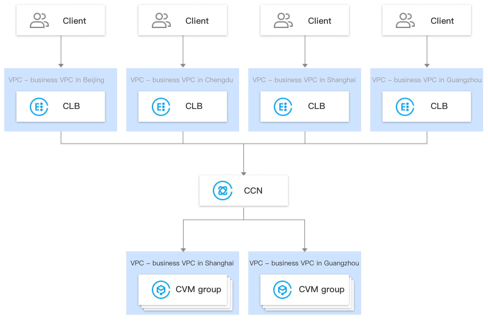 CLB mendukung pengikatan instance CVM lintas wilayah melalui CCN, membuat Anda bisa memilih server asli dari wilayah berbeda dan mengikat instance CLB pada mereka di seluruh VPC atau wilayah.