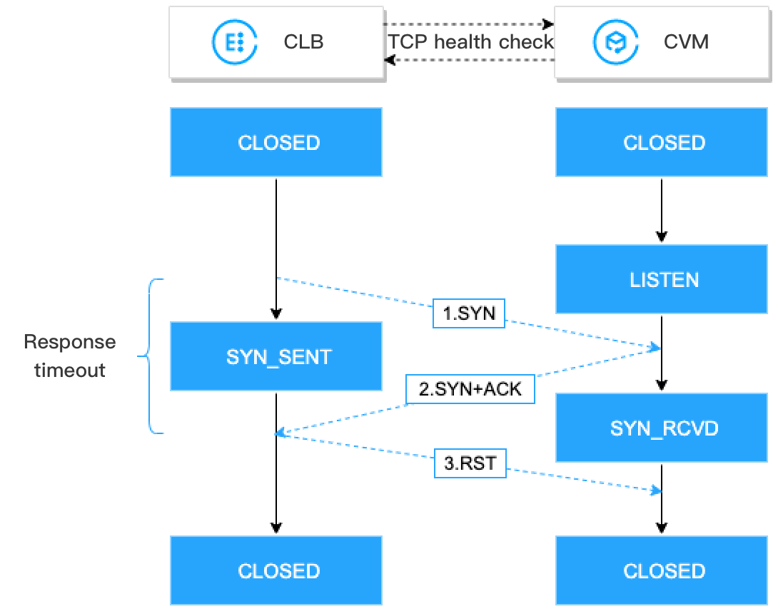 4.Jika instance CLB tidak menerima paket respons SYN-ACK yang dikembalikan dalam waktu habis respons, hal tersebut menunjukkan bahwa kondisi server asli abnormal dan hasil pemeriksaan kesehatan gagal.Instance CLB akan mengirimkan paket TCP Reset (RST) ke instance CVM backend untuk memutus koneksi TCP.