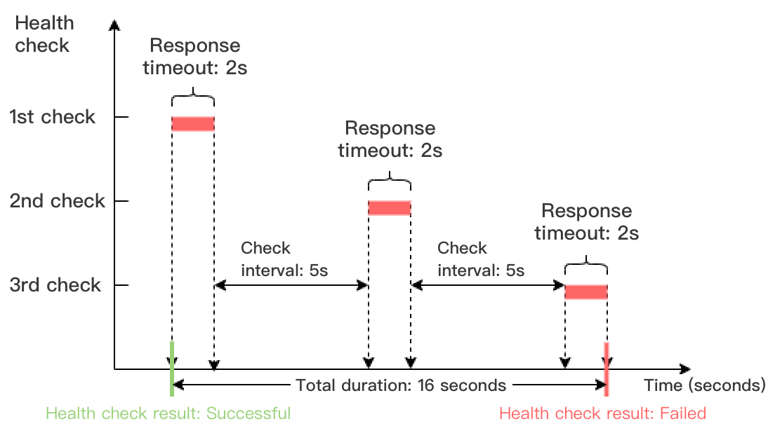 Dalam contoh di bawah ini, waktu habis respons pemeriksaan kesehatan yaitu 2 detik, interval pemeriksaan 5 detik, dan ambang batas tidak sehat 3 kali sehingga periode pemeriksaan kesehatan dengan hasil gagal = 2 x 3 + 5 x (3-1) = 16 detik.
