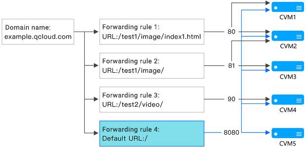 1.Karena example.qloud.com/test1/image/index1.html benar-benar cocok dengan aturan URL yang dikonfigurasikan dengan kelompok penerusan 1, permintaannya akan diteruskan ke server asli yang terkait dengan kelompok penerusan 1, yaitu, port 80 dari CVM1 dan CVM2 dalam gambar.
