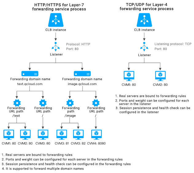 CLB lapisan 7 bisa meneruskan permintaan dari nama dan URL domain berbeda ke server-server berbeda.Pendengar lapisan 7 bisa dikonfigurasikan dengan beberapa nama domain, yang masing-masing bisa dikonfigurasikan dengan beberapa jalur penerusan.