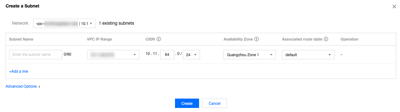 Tambahkan baris: klik Add a line (Tambahkan baris) untuk membuat beberapa subnet sekaligus. Klik untuk menghapus pengaturan subnet yang dipilih. Opsi Lanjutan: Anda dapat secara opsional mengatur tag untuk subnet agar mengelola sumber informasi subnet dengan lebih baik. Klik Add (Tambahkan) untuk mengatur beberapa tag sekaligus. Anda dapat mengeklik ikon di kolom Operation (Operasi) untuk menghapus pengaturan tag yang dipilih.