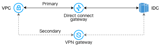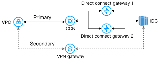 Scenario (Skenario): interkoneksikan Tencent Cloud VPC dan IDC lokal melalui direct connect gateway berbasis VPC. Sementara itu, buat tunnel VPN melalui VPN gateway untuk bertindak sebagai penautan komunikasi sekunder antara IDC dan VPC.