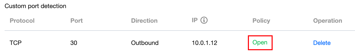 Jika Anda perlu mendeteksi lalu lintas keluar menuju IP 10.0.1.12 menggunakan protokol TCP melalui port 30, masukkan informasi berikut di area Custom port detection (Deteksi port kustom).