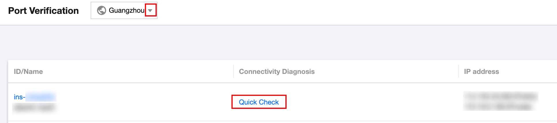 3. Pilih wilayah di bagian atas halaman, temukan instans yang ingin Anda verifikasi dalam daftar, dan klik Quick Check (Periksa Cepat).