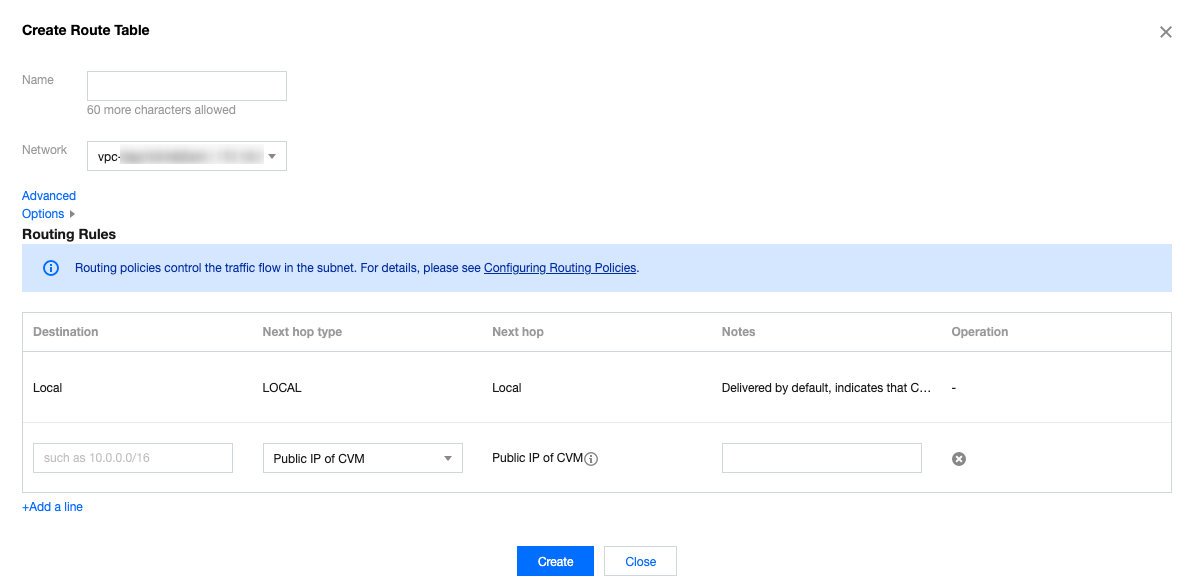 Tujuan | Rentang IP tujuan tempat lalu lintas diteruskan. Konfigurasi harus memenuhi persyaratan berikut: Masukkan rentang IP. Jika Anda ingin memasukkan satu IP, atur mask ke 32 (misalnya, `172.16.1.1/32`). Tujuan tidak boleh berupa rentang IP VPC tempat tabel rute berada karena rute lokal telah mengizinkan interkoneksi jaringan pribadi di VPC ini. Catatan: Jika telah men-deploy Layanan TKE di VPC, tujuan yang Anda konfigurasikan di kebijakan tabel rute subnet VPC tidak boleh berada dalam blok CIDR VPC atau berisi rentang IP TKE. Misalnya, jika blok CIDR VPC adalah `172.168.0.0/16` dan blok TKE CIDR adalah `192.168.0.0/16`, rentang IP tujuan tidak boleh berada dalam `172.168.0.0/16`, atau berisi `192.168 .0.0/16` saat Anda mengonfigurasi kebijakan perutean untuk subnet VPC. |