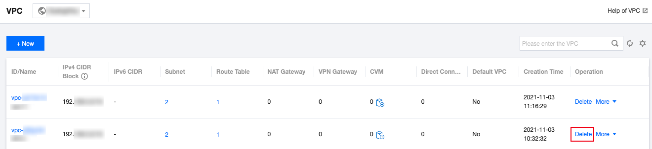 3. Dalam daftar VPC, temukan VPC yang akan dihapus, klik Delete (Hapus) di bawah kolom Operation (Operasi), lalu konfirmasi penghapusan.