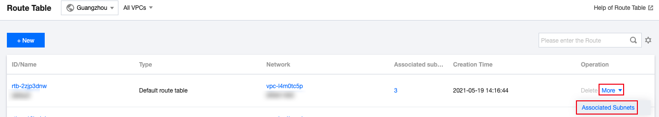 Dalam daftar, pilih tabel rute yang perlu dihubungkan ke subnet, dan klik More (Lainnya)> Associated Subnet (Subnet Terhubung) di kolom Operation (Operasi).