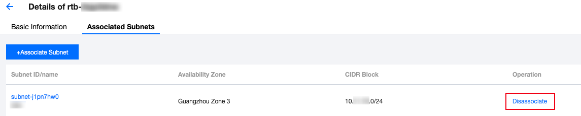 3. Klik ID tabel rute untuk membuka halaman detail, beralih ke tab Associated Subnet (Subnet Terhubung), dan klik Disassociate (Putuskan Koneksi).