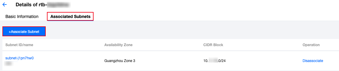 Klik ID tabel rute untuk membuka halaman detail, pilih tab Associated Subnet (Subnet Terhubung), dan klik +Associate Subnet (+Hubungkan Subnet).