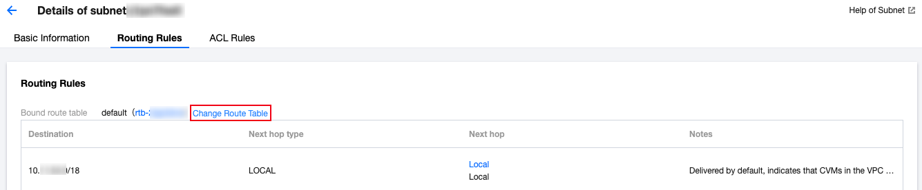 Klik ID subnet yang perlu diubah tabel rutenya untuk membuka halaman detail, beralih ke tab Routing Rules (Aturan Rute), dan klik Change Route Table (Ubah Tabel Rute).