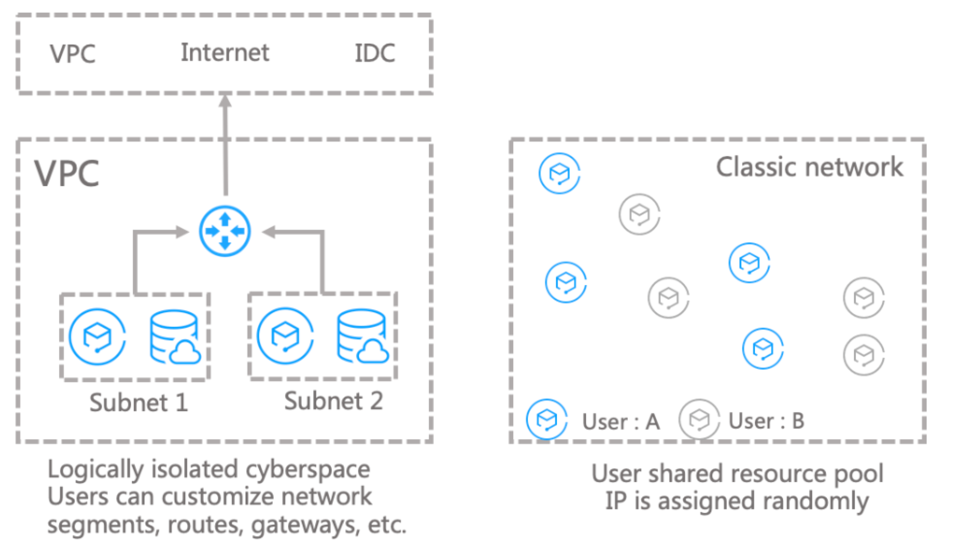 Sebaliknya, VPC adalah ruang jaringan yang terisolasi secara logis di Tencent Cloud (seperti yang ditampilkan di sisi kiri gambar di bawah). Di VPC, Anda dapat menyesuaikan rentang IP, alamat IP, dan kebijakan perutean. VPC lebih cocok untuk kasus penggunaan yang memerlukan konfigurasi kustom.