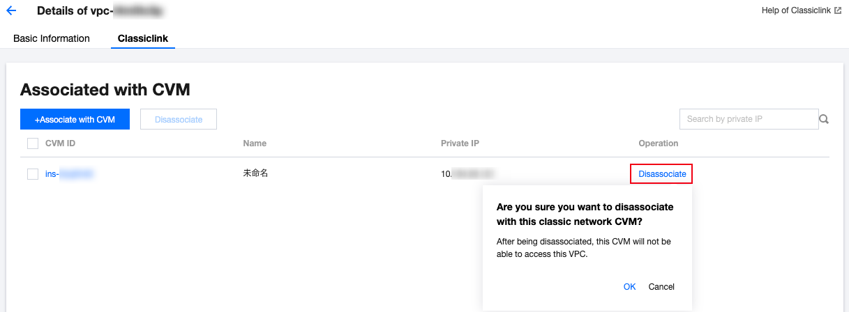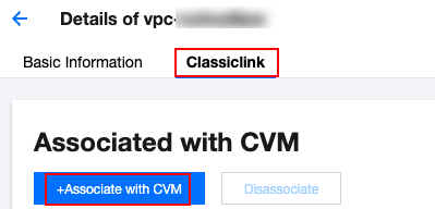 3. Klik tab Classiclink (Classiclink), pilih CVM yang akan dibatalkan hubungannya dari daftar CVM berbasis jaringan klasik, lalu klik Disassociate (Batalkan Hubungan) di kolom Operation (Operasi).