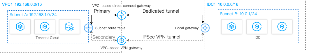 VPN connection (sekunder): membuat tunnel VPN IPsec untuk menghubungkan IDC lokal dan Tencent Cloud VPC. Saat tautan koneksi gagal, lalu lintas akan diteruskan menggunakan tautan ini untuk memastikan ketersediaan bisnis.