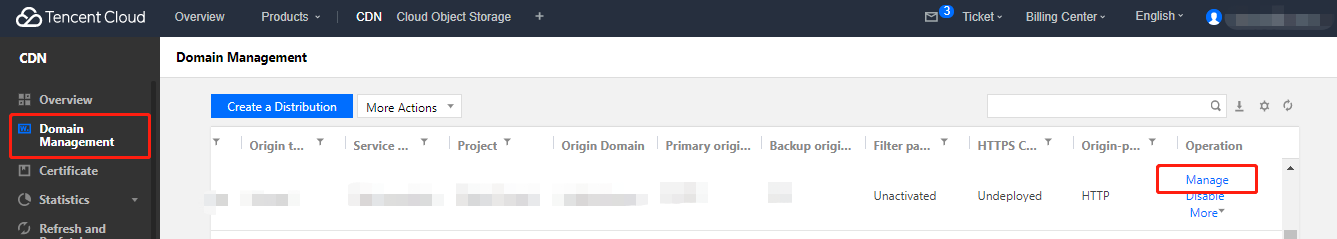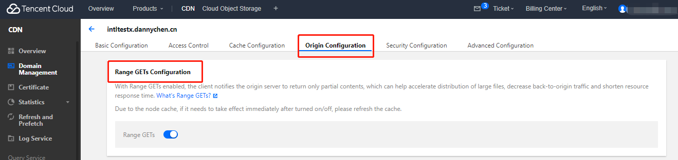 Masuk ke Konsol CDN, pilih Domain Management (Pengelolaan Domain) di bilah sisi kiri, dan klik Kelola di kanan nama domain yang ingin Anda edit.Untuk informasi selengkapnya, silakan lihat Konfigurasi Range GETs.
