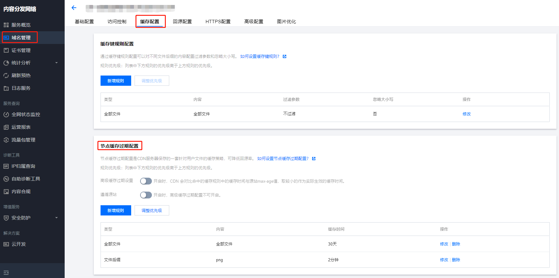 Masuk ke konsol CDN, pilih Domain Management (Pengelolaan Domain) di bilah samping kiri, klik Manage (Kelola) di kanan nama domain untuk masuk ke halaman konfigurasinya, dan pindah ke tab Cache Configuration (Konfigurasi Cache) untuk menemukan bagian Node Cache Validity Configuration (Konfigurasi Validitas Cache Simpul).