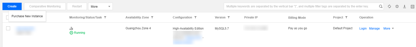 Penyesuaian konfigurasi | Dalam daftar instans, klik More (Lainnya) di kolom Operation (Operasi) untuk menyesuaikan konfigurasi (yaitu, penskalaan) instans database Anda. Baik peningkatan maupun penurunan versi instans didukung. Untuk informasi selengkapnya, lihat Menyesuaikan Spesifikasi Instans Database. |