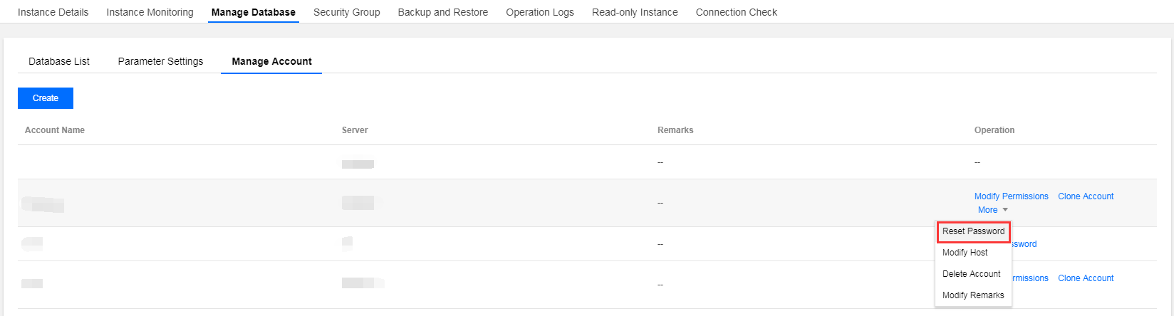 1. Login ke Konsol TencentDB for MySQL. Dalam daftar instans, klik ID instans atau Manage (Kelola) di kolom "Operasi" untuk masuk ke halaman manajemen instans. 2. Pilih Database Management (Manajemen Database) > Manage Account (Kelola Akun), cari akun yang akan digunakan untuk mengatur ulang kata sandi, dan pilih More (Lainnya) > Reset Password (Atur Ulang Kata Sandi).