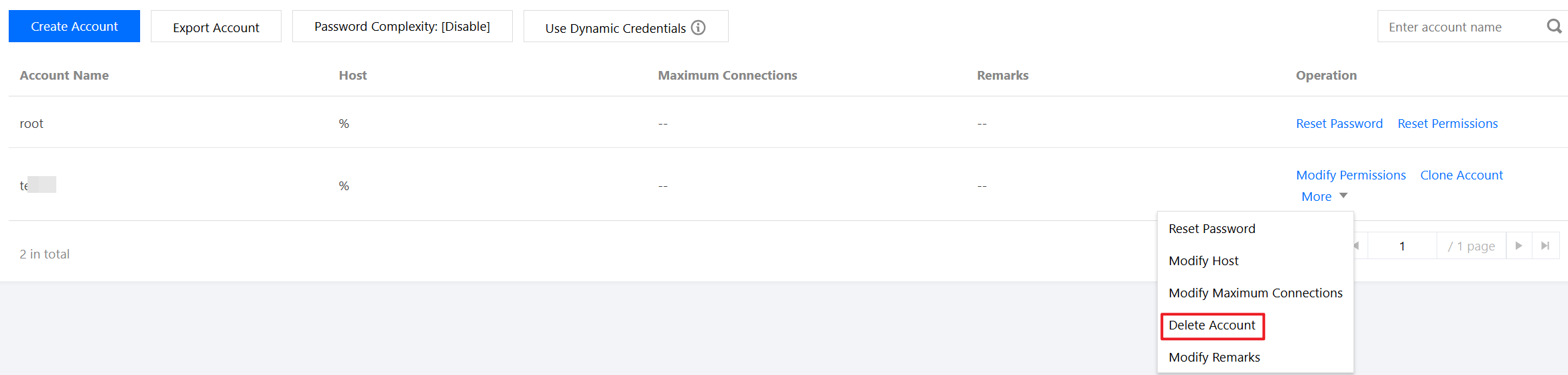 Untuk menonaktifkan akun database yang ada, akun tersebut harus dihapus di Konsol TencentDB for MySQL.