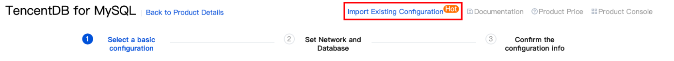 Halaman pembelian versi baru mendukung Impor konfigurasi yang sudah ada dengan sekali klik. Ketika akun yang login memiliki instance TencentDB for MySQL yang sudah dibuat, berbagai parameter pada halaman pembelian instance dapat dikonfigurasi otomatis menggunakan fungsi ini, sehingga memudahkan Anda dalam melakukan penyesuaian cepat atau pembelian langsung berdasarkan konfigurasi yang ada. Panduan operasinya adalah sebagai berikut.