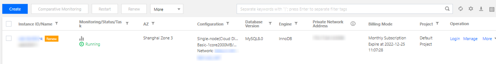 Templat Parameter: Selain templat parameter sistem yang disediakan, Anda juga dapat membuat templat parameter kustom, lihat Menggunakan Templat Parameter. Set Karakter: Mendukung set karakter LATIN1, GBK, UTF8, UTF8MB4. Format pengkodean set karakter default adalah UTF8. Setelah pembelian selesai, set karakter juga dapat dimodifikasi di halaman detail instance pada konsol. Untuk penjelasan lebih lanjut, lihat Penjelasan Set Karakter. Aturan Pengurutan: Aturan pengurutan yang disediakan oleh set karakter instance untuk data sistem, yaitu atribut peka huruf besar/kecil dan atribut aksen.